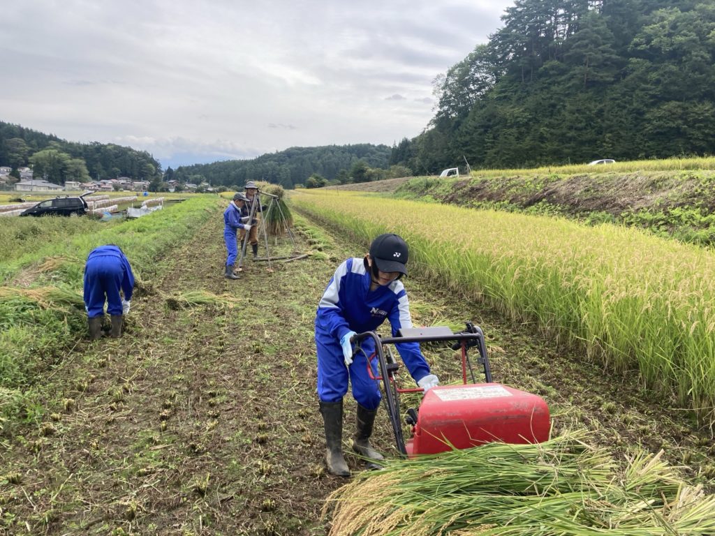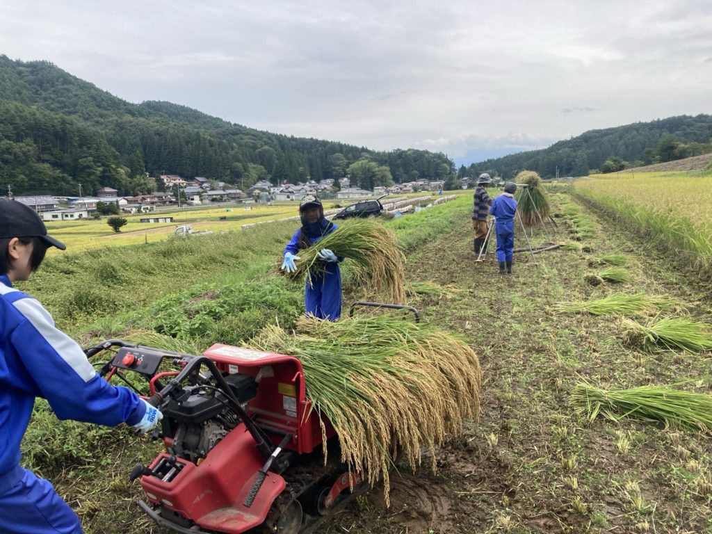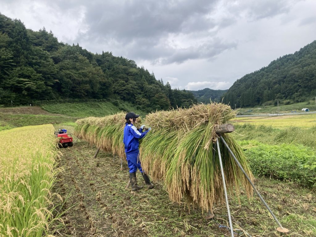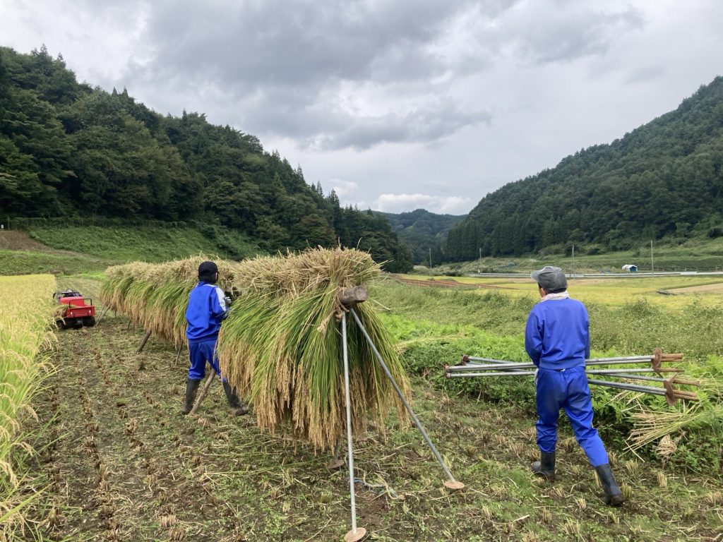 バインダーという機械で夫さんが稲を刈ります。刈りながら束ねていく、すごい機械です。束ねられた稲を、わたしとこどもたちで集めて、「はぜ」にかけていきます。2週間ほど天日に干して、脱穀します。